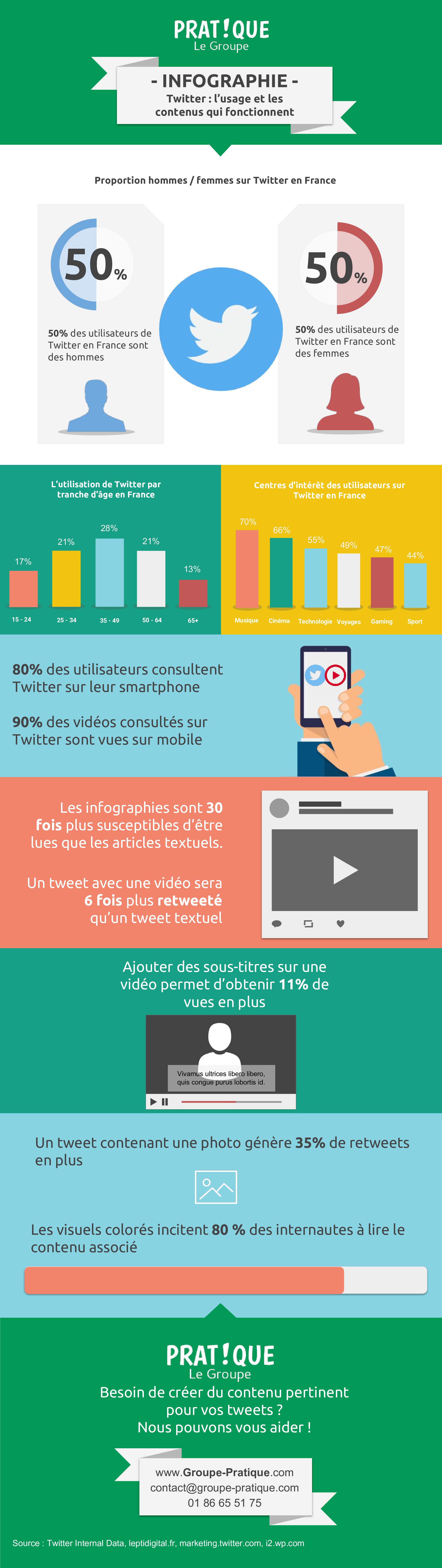 Contrairement à Facebook, Instagram, Pinterest ou Snapchat, Twitter est un réseau social particulièrement homogène. Il regroupe autant d’hommes que de femmes et ses utilisateurs ont une répartition générationnelle assez équilibrée. Avec cette infographie, nous listons les supports les plus pertinent qui vous permettront de mieux convertir.